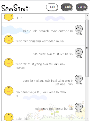 Saya bosan sekarang. Adakah anda yang berada disana dirumah juga turut bosan? Hari ni main dengan SimSimi. Mengarut benda ni sebenarnya. Tapi kalau dilayan makin menjadi robot yang direka manusia ni. Perbualan pertama aku dengan Simi.
